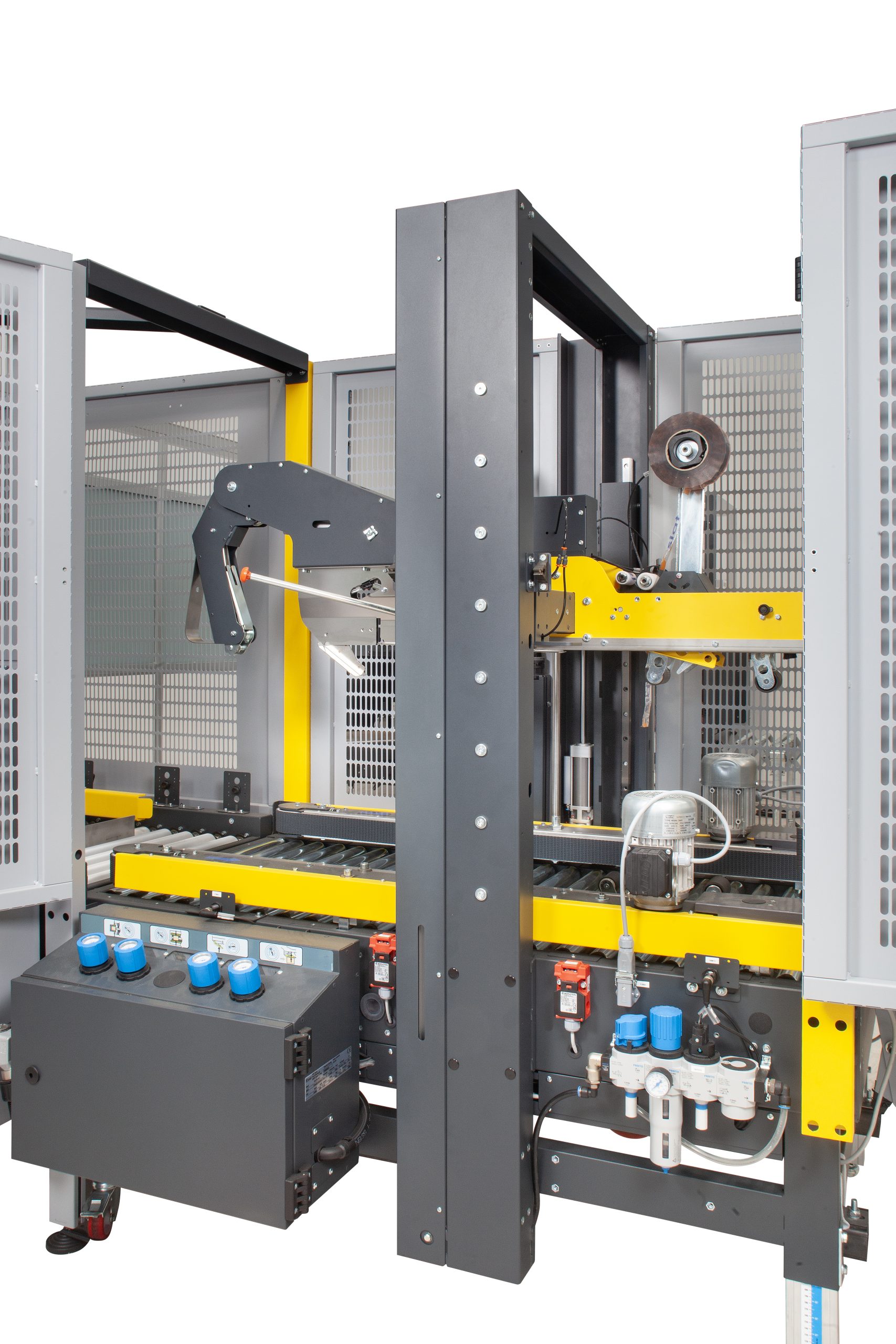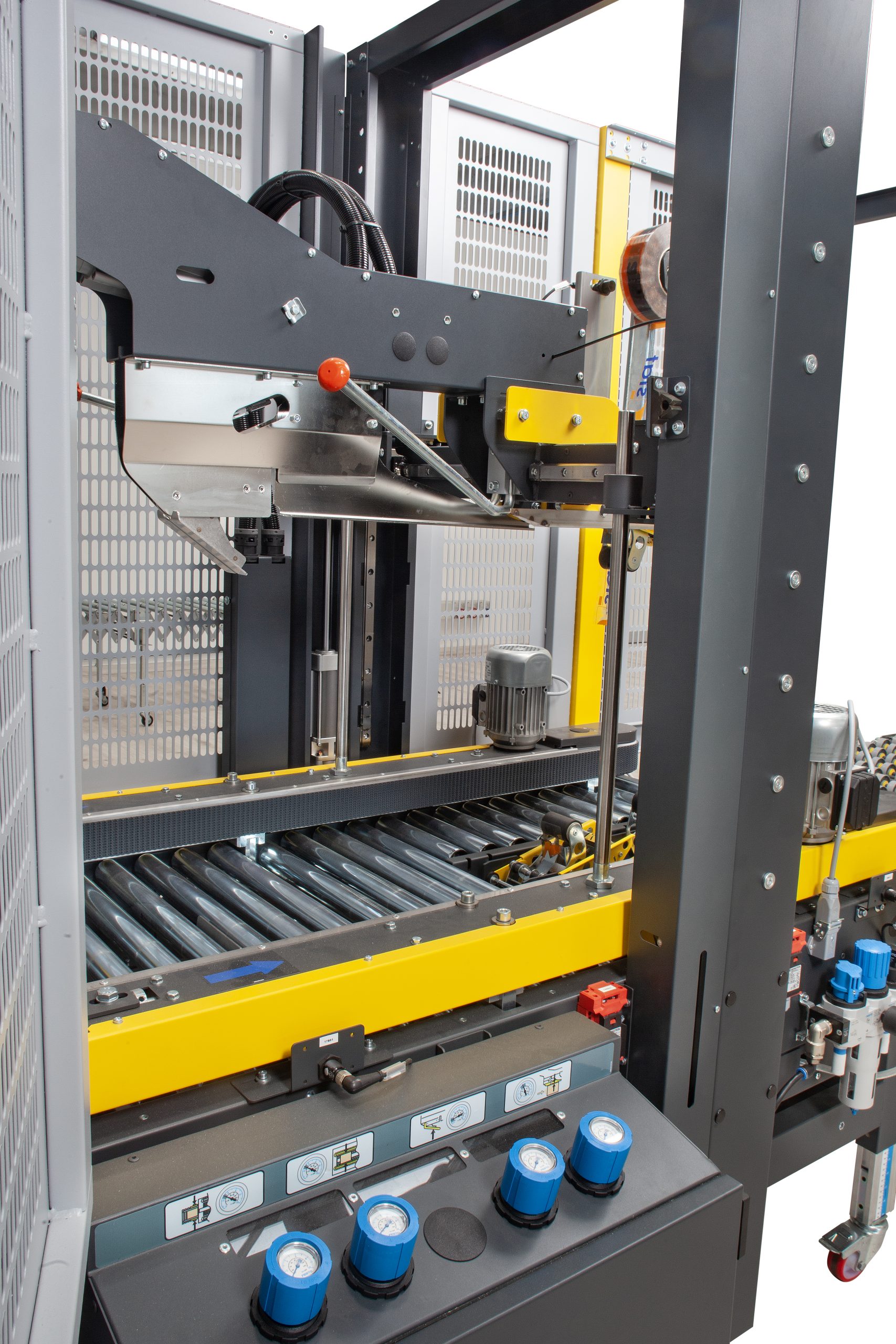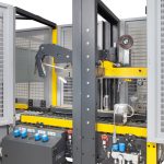 - Automatically folds and seals the box’s top flaps with an automatic four-flaps-folder device